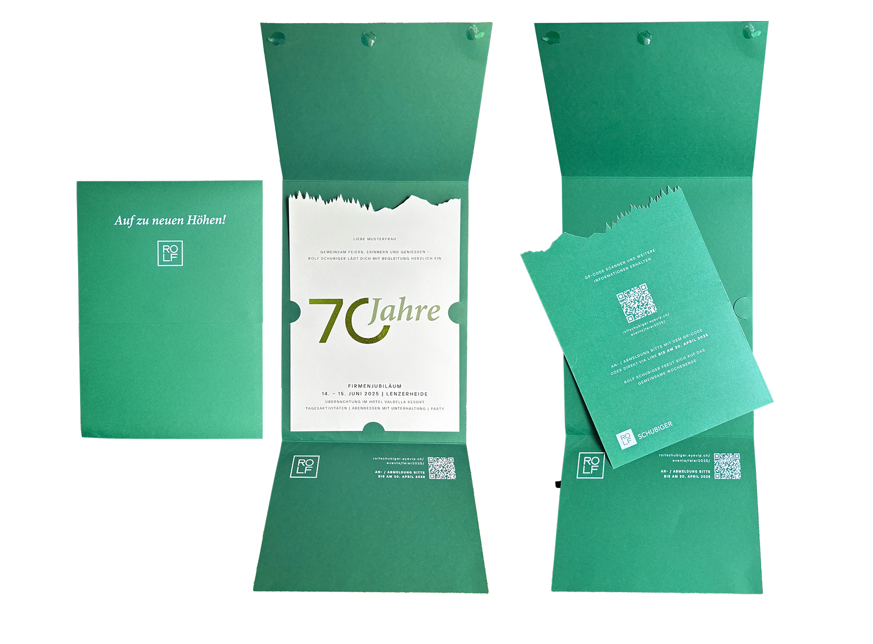 Zum 70-Jahre-Jubiläum von Rolf Schubiger sollte der Anlass nicht nur gefeiert, sondern auch visuell spürbar werden. Dafür gestaltete ich eine hochwertige Einladung als Auftakt zum grossen Fest – edel und der Location in den Bergen entsprechend.